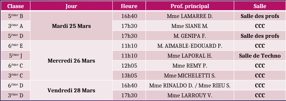 • Du Lundi 16 au Vendredi 20 Juin 2025 se dérouleront les conseils de classes de 3ème trimestre de la 6ème à la 4ème